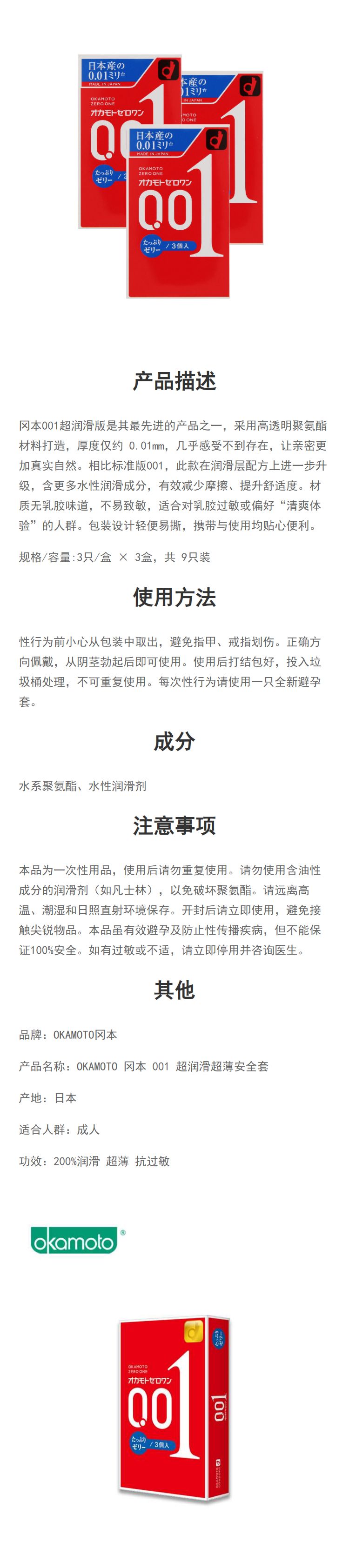【组合装优惠】OKAMOTO冈本 001超润滑超薄安全套避孕套 3只装*3